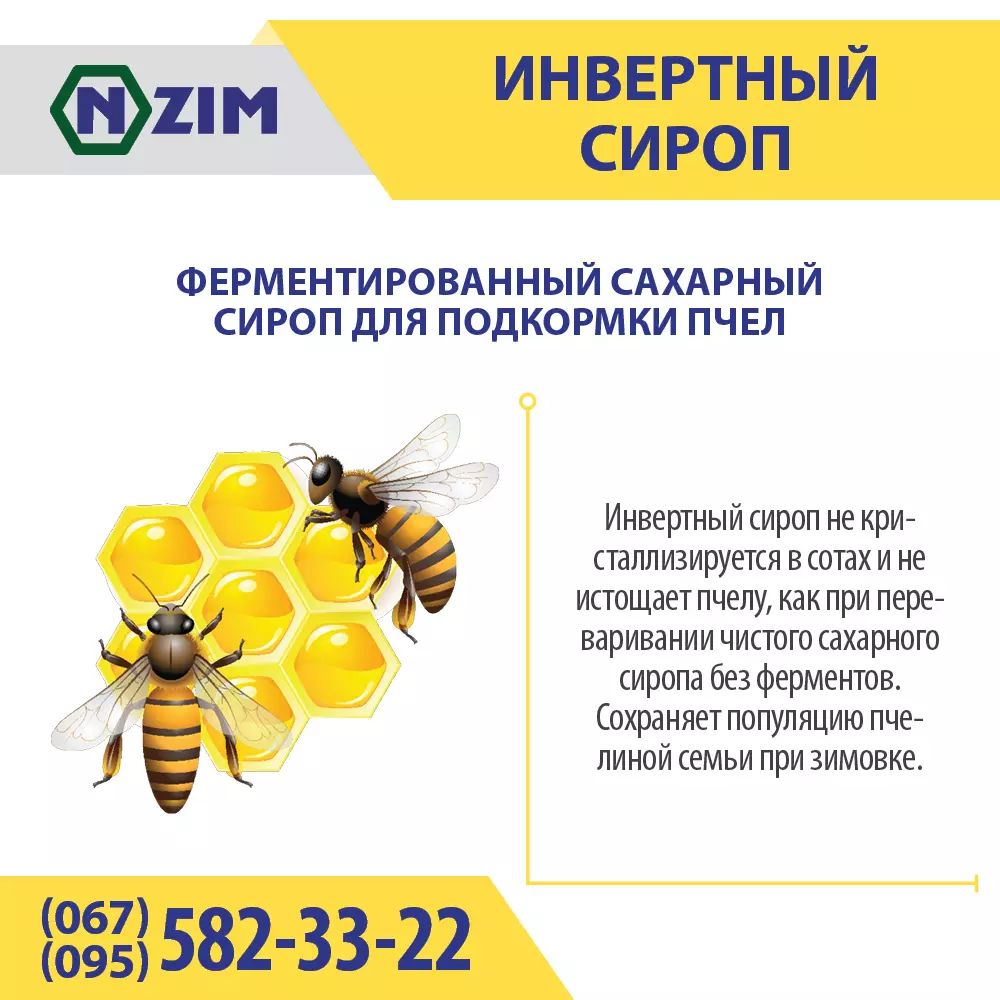 - ферментированный сахарный сироп в доступной для усвоения пчёлами форме. Фермент инвертаза расщепляет сахарозу на составляющие: моносахара, глюкозу и фруктозу, в доступную для усвоения пчёлами форму. Инвертный сироп не кристаллизируется в сотах и не истощает пчелу при переваривании сахарного сиропа без ферментов, сохраняет популяцию пчелиной семьи при зимовке.